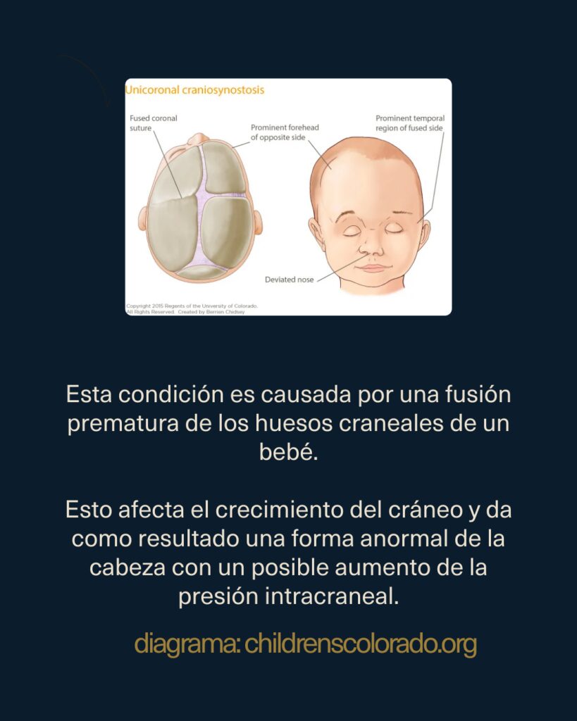 La craneosinostosis ocurre cuando una o más suturas del cráneo del bebé se cierran prematuramente, afectando el crecimiento normal del cerebro y la forma de la cabeza. De no tratarse a tiempo, puede provocar complicaciones en el desarrollo neurológico. En Puerto Rico, se estima que alrededor de 10 niños al año nacen con esta condición.