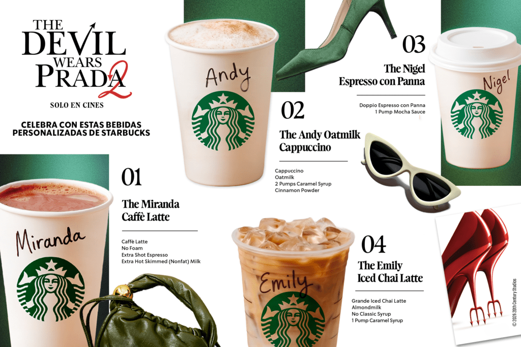A partir de 28 de abril, los consumidores podrán descubrir cuatro personalizaciones inspiradas en los personajes al estilo de Starbucks, cada una como un reflejo lleno de sabor de las personalidades que los fans han amado en el universo de The Devil Wears Prada.