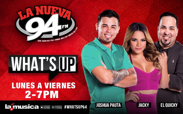 Rogie Gallart, Director de Programación de La Nueva 94FM, informó que el programa está dirigido a una audiencia adulta entre las edades de 18 a 34 años y que está seguro de que los radioescuchas se divertirán muchísimo y no querrán despegarse de La Nueva 94FM con este dinámico programa. El productor radial de “What’s Up” es el respetado “Rocky The Kid” quien también forma parte del programa matutino “El Despelote” en la misma estación.