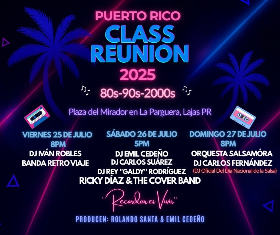 Es hora de revivir los mejores años de tu vida, es por esto que bajo el lema “Recordar es Vivir” llega el Puerto Rico Class Reunion 2025, un evento que reúne a las clases graduadas de los 80s, 90s y 2000s en una fiesta llena de nostalgia, amistad y ritmo. La primera parada de esta gira será del viernes 25 al domingo 27 de julio en la Plaza del Mirador en La Parguera, Lajas. Desde ahí nos vamos por todo Peerre.