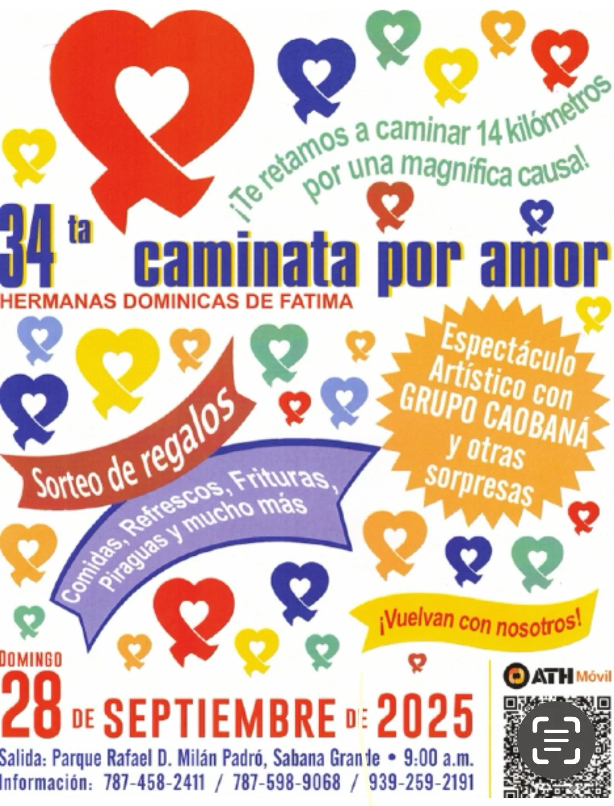 Las Hermanas Dominicas de Fátima les invita a la 34ta Caminata por Amor, que se llevará a cabo el domingo, 28 de septiembre de 2025. Esta es una actividad que se celebra una vez al año con el fin de recaudar fondos. Este año pondremos prioridad en comenzar la restauración de nuestra Casa Madre ya que tras el terremoto 2020 aún no se ha contado con ayuda y no hemos podido hacer nada, ya tiene demasiadas filtraciones. Guarda la historia de nuestra fundadora, la Sierva de Dios, M. Dominga Guzmán Florit, O.P. y nuestras misiones en Venezuela, Santo Domingo y otra que se abrirá pronto en Perú además de nuestras obras y proyectos en pro de las familias y otras necesidades de la Congregación. Esta caminata tiene un propósito espiritual: los participantes caminan por sus intenciones y las de las personas que los auspicien.